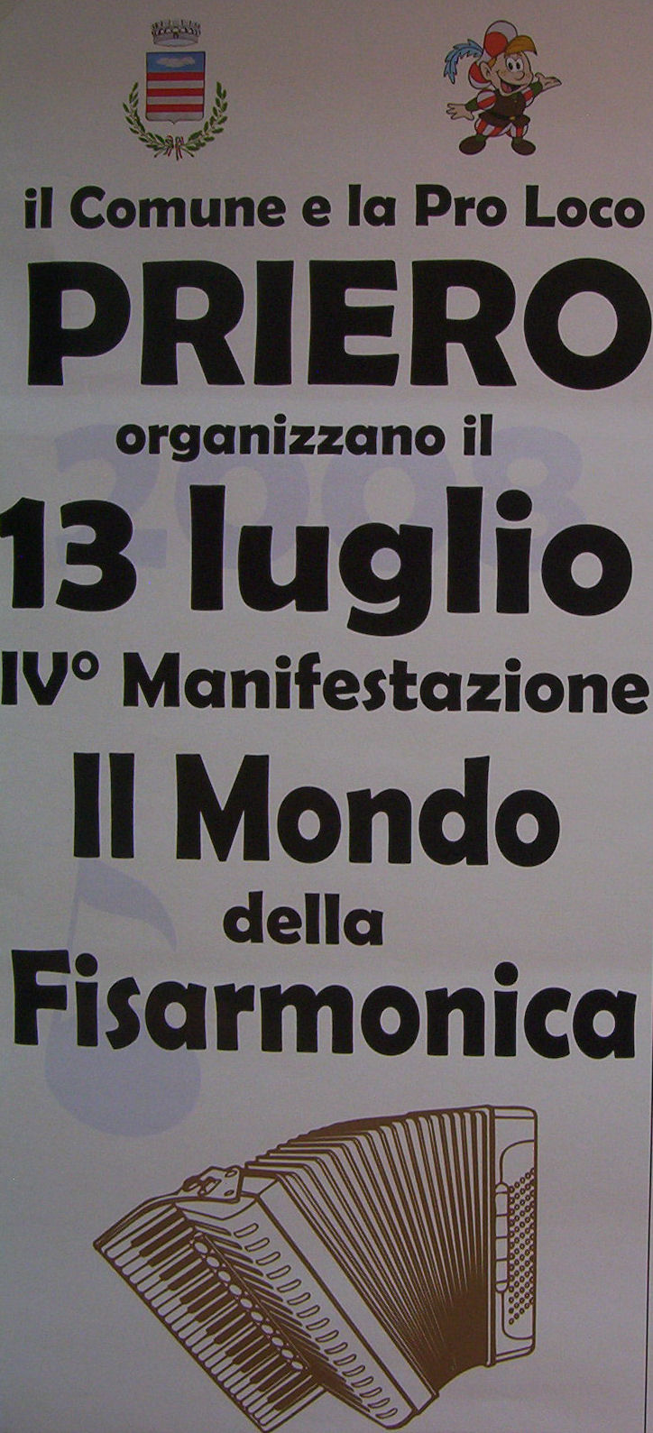 DOMENICA 13 LUGLIO 2008 SAREMO PRESENTI CON LE NOSTRE FISARMONICHE ALLA 4a MANIFESTAZIONE "IL MONDO DELLA FISARMONICA" NEL COMUNE DI PRIERO IN PROVINCIA DI CUNEO.
