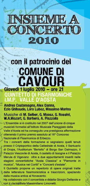 GIOVEDI' 1 LUGLIO 2010 ALLE ORE 21 IL QUINTETTO DI FISARMONICHE I.M.P. VALLE D'AOSTA COMPOSTO DA ANDREA COSTAMAGNA , ALEX DANNA , EZIO GHIBAUDO , LARA LUBOZ E MASSIMO MARINO SI ESIBIRA' IN CONCERTO A CAVOUR IN PROVINCIA DI TORINO PRESSO I GIARDINI DELL'ABBAZIA.