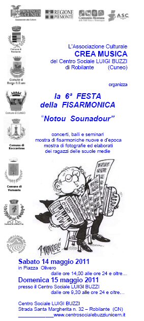 DOMENICA 15 MAGGIO 2011 VI ASPETTIAMO COME OGNI ANNO A ROBILANTE , IN PROVINCIA DI CUNEO , IN OCCASIONE DELLA 6a FESTA DELLA FISARMONICA ORGANIZZATA DALL'ASSOCIAZIONE CULTURALE " CREA MUSICA " DEL CENTRO SOCIALE LUIGI BUZZI.