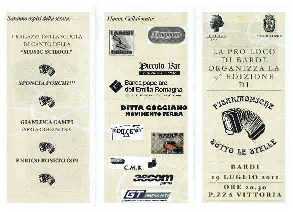 MARTEDI' 19 LUGLIO 2011 VI ASPETTIAMO A BARDI IN PROVINCIA DI PARMA IN OCCASIONE DELLA 9a EDIZIONE DI "FISARMONICHE SOTTO LE STELLE". OSPITI DELLA SERATA GIAN LUCA CAMPI , ENRICO ROSETO E GLI SPUNCIAPORCHI.